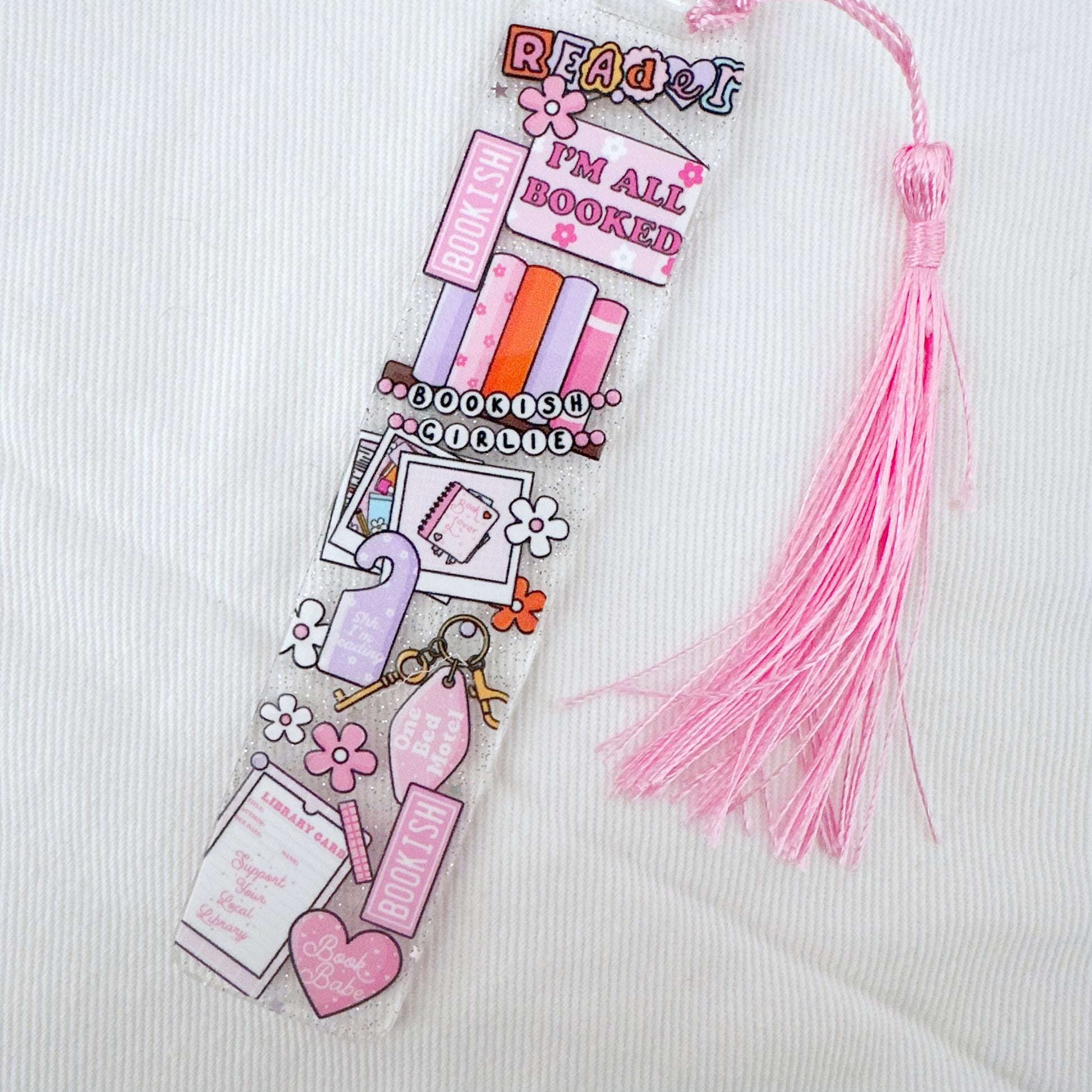 Sparkly and unapologetically bookish, this Bookish Girlie glitter acrylic bookmark is perfect for readers who love feminine aesthetics and cozy reading vibes.