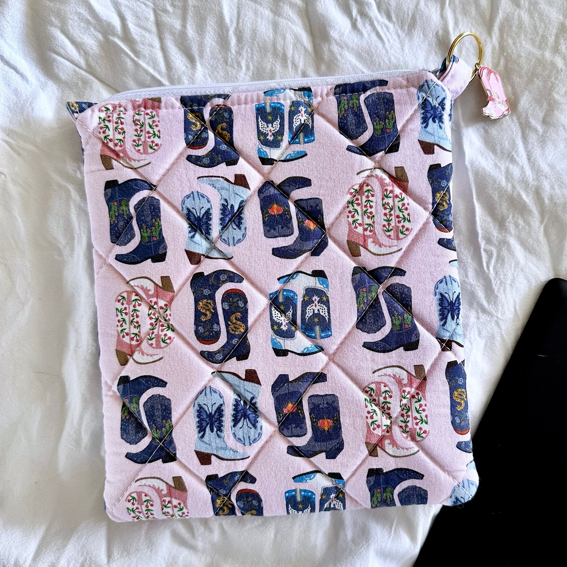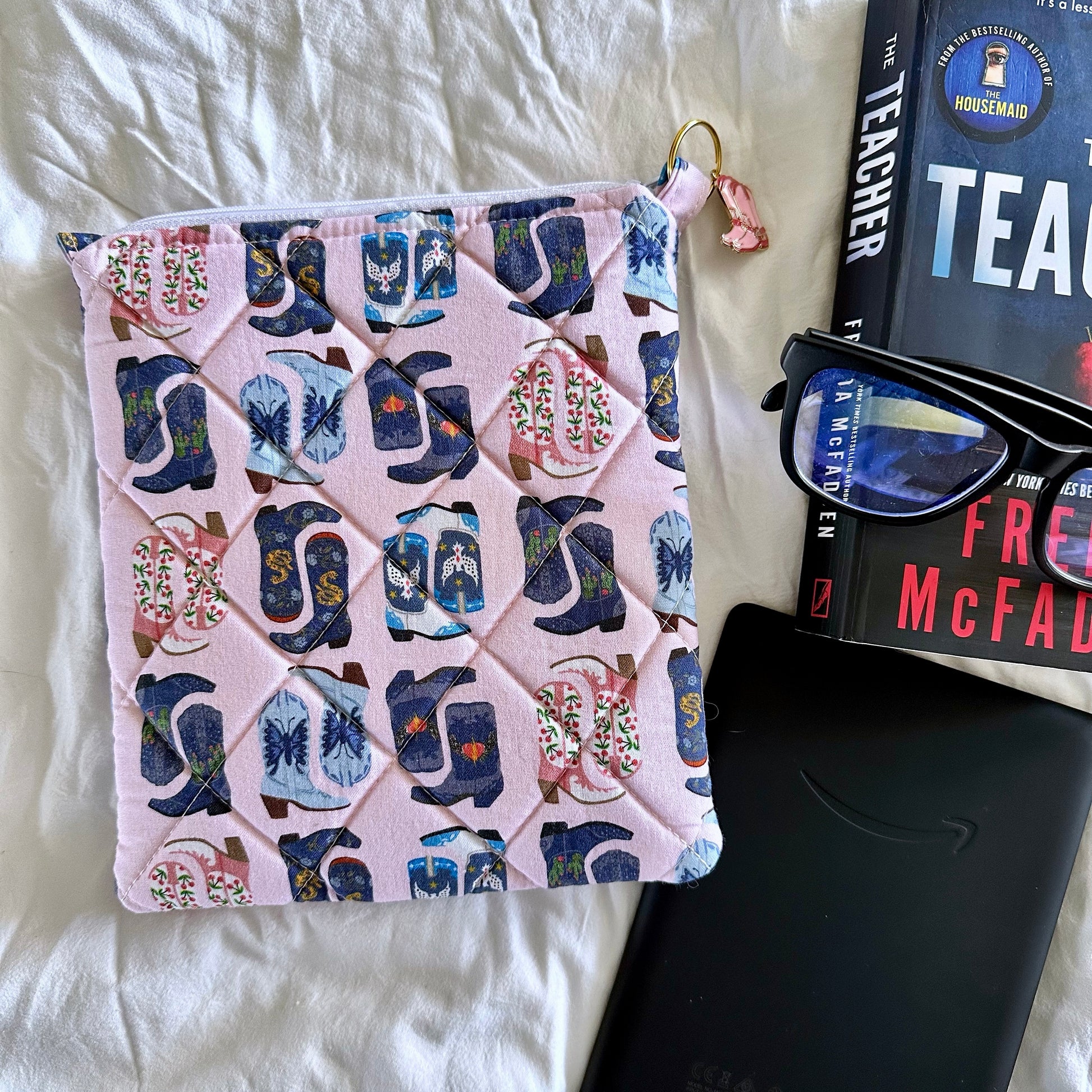 Cowgirl Boot Print Quilted Kindle Sleeve β Handmade Padded E-Reader Case with Charm